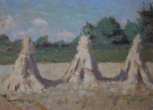 Het is hoog zomer, de hitte trilt over de velden het geeft een bijzondere waas. De korenschoven geplaatst in hokken op het land geven vele lichte kleuren weer.