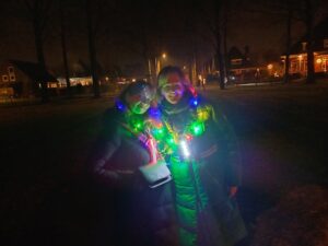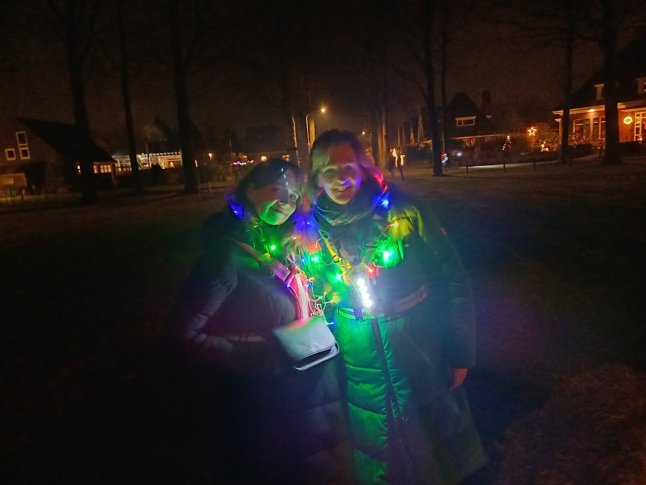 De route liep ook door de Kloosterheerd: een beschermde woonvorm van Zorggroep Meander. We werden getrakteerd op een optreden van een koor met een hoog Jostiband-gehalte: prachtig om te zien hoe de artiesten zelf ontzettend genoten van het zingen van Jinglebells en Kling klokje klingelingeling. Daar kochten we een beker warme chocolademelk en een broodje knakworst, want we hadden nog niet gegeten.