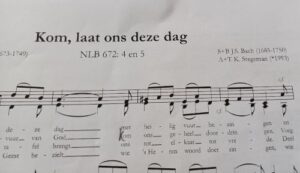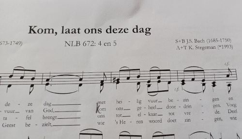 We begonnen de viering met het zingen van lied 672 ‘Komt laat ons deze dag’, een pinksterlied geschreven door J.S. Bach. Karel had daar voor de tenor- en de altpartij een nieuwe bewerking van gemaakt, dus zijn naam stond prominent onder die van de grote meester op ons muziekpapier; zie daarvoor de afbeelding rechts.