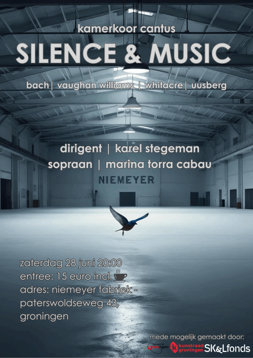 Silence & Music biedt een unieke muzikale ervaring waarin stilte en muziek samenkomen. Onder de bezielende leiding van dirigent Karel Stegeman neemt het koor het publiek mee op een reis door uiteenlopende muzikale werken die de relatie tussen stilte en klank verkennen. Met dit project viert Cantus de eindelijk geopenbaarde akoestiek van de Niemeyer fabriek – én genieten we van de stilte na jaren van overlast in de wijk door de industrie. Het repertoire gaat over muziek en stilte, met bijzondere aandacht voor stemmen die het zwijgen zijn opgelegd.