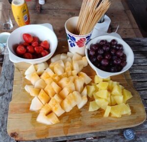 Hartige groentetaart, tonijnsalade, kibbeling, gehaktballetjes, brusschetta, fruitstokjes…….wat heerlijk en wat gezellig.