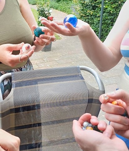 Een grote zak met oude knikkers had het leukste effect: de knikkers werden er met handenvol tegelijk uitgehaald en benoemd.