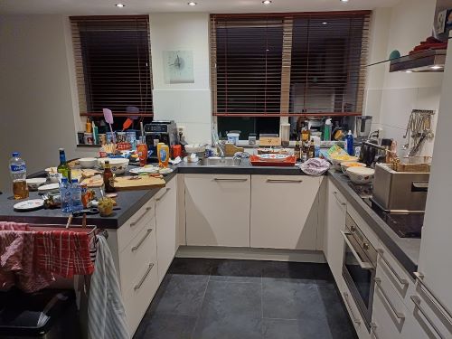 Toen we iedereen hadden uitgezwaaid was ons aanrecht één groot slagveld.