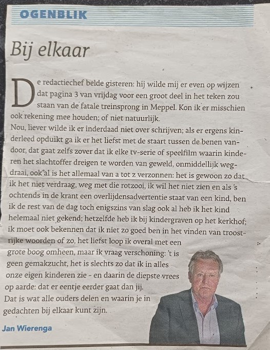 Het liefst loop ik overal met een grote boog omheen. Maar ik vraag verschoning: ’t is geen gemakzucht, het is slechts zo dat ik in alles onze eigen kinderen zie en daarin de diepste vrees op aarde: dat er eentje eerder gaat dan jij. Dat is wat alle ouders delen en waarin je in gedachten bij elkaar kunt zijn.Jan Wierenga