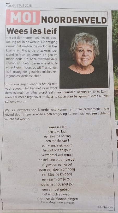Ze schreef over de toestand in de wereld: over de oorlogen in Oekraïne en Gaza, de onveurspelbaorheid van wereldleiders Trump en Poetin en de politieke toestand in oons laand. Ze constateert dat wij as inwoners van Noordenveld daor niet zo veul an kunt doen, maor dat wij in oonze eigen umgeving toch een lichtend veurbeeld wezen kunt.