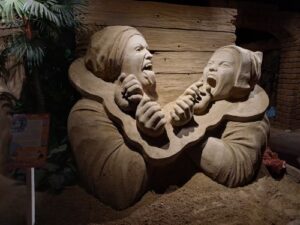 Dit was de informatie die bij het tafereel stond: Vrouwen die hadden gevochten, werden in de ‘vedel’ (viool) gezet. Aan de brede kant zat een gat voor het hoofd, en in de hals had het ‘instrument’ openingen voor de handen. Een vrouw zat vaak met het gezicht naar degene met wie ze het aan de stok had gehad.