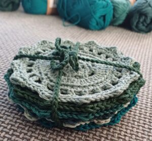 Dat heb ik zelf ontworpen en als eerbetoon aan mijn oma ‘Aaltje’ genoemd: er hebben al heel wat mensen een stapeltje van 6 door mij gehaakte Aaltjes in huis liggen.