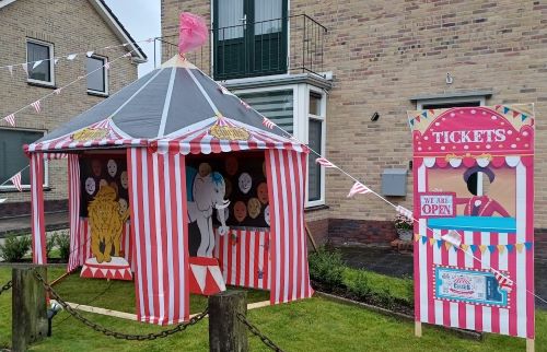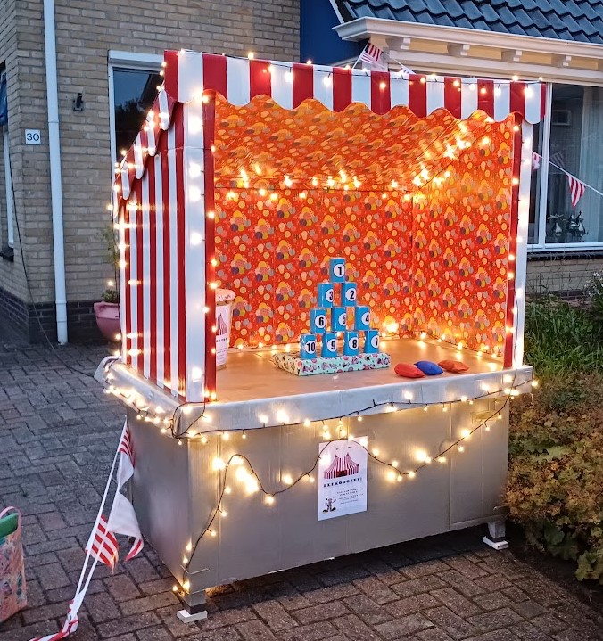 Het algemene thema van de Rodermarktparade is ‘Nostalgie & Heimwee’ en onze straat haakt daar bij aan met het sub-thema ‘Kermis & Circus’. Gerard is een dikke week bezig geweest met knutselen aan een kermiskraam waarin men kan blikgooien. Eerst ging hij naar de fietsenwinkel om te vragen om van die grote, kartonnen dozen die om nieuwe fietsen zitten, daarna naar de Action voor verf en vrolijk pakpapier, op internet bestelde hij een blikgooispel en tenslotte rommelde hij tussen de kerstspullen om een streng buitenverlichting te zoeken.
