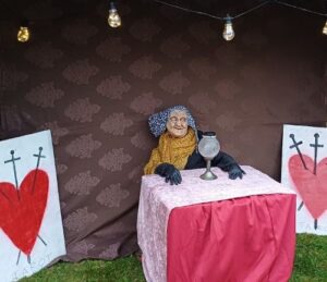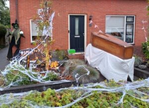 Toen we gisteravond een laatste rondje maakten werden we ineens aangesproken door iemand die in een doodskist lag die op een kier stond; er krinkelde een beetje rook uit de kist… Daarnaast stond een schrikbarend enge heks die af en toe oplichtte en kakelend lachte en in de tuin van onze buren zat een oude waarzegster met een glazen bol.