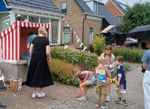 Waar ik normaal gesproken op zo’n dag minstens vier keer op een punt langs de route sta, bleef het deze zaterdag bij twee keer. ’s Middags kwam dat omdat het rond drie uur begon te regenen en ’s avonds duurde het gewoon allemaal veel te lang. Er was een wagen met pech wat zorgde voor enorm oponthoud: ik wilde er niet langer op wachten. Ik was moe en was niet helemaal fit door de coronaprik die ik vrijdag had gehaald; om 21.00 uur zat ik bij Gerard aan de koffie, de rest bleef nog wel kijken: even voor half 10 kwamen ze thuis. Tussen de bedrijven door waren we nog druk met onze ‘blikgooi-kraam’: er kwamen nog heel wat kindjes langs die wilden blikgooien en vooral het grabbelen daarna viel goed in de smaak.