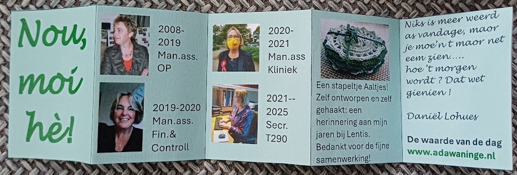 Er kwamen nog wat collega’s om me alvast de hand te schudden en toen was er eigenlijk geen tijd meer om nog van alles te doen…… ik moest het werk loslaten en aan de collega’s overdragen.