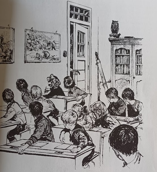 Het bracht mij even terug naar mijn eigen kindertijd; dat kwam ook door de tekeningen van Poortvliet die beelden uit de jaren ’60 laten zien. Als voorbeeld een tekening van de schoolklas uit die tijd: die deur op een kier en die mijter daarachter! Ik weet nog hoe dan je hart in je keel klopte en dan gooide Piet heel hard pepernoten door het lokaal!
