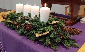 Even daarvoor had hij nog moeten improviseren, want we zongen bij het aansteken van de vier adventskaarsen het oude kinderliedje ‘Jezus zegt dat hij hier van ons verwacht, dat wij zijn als kaarsjes brandend in de nacht’. Dat kende Erwin niet (!), maar gelukkig: het werd, mét notenbalk, op de beamer geprojecteerd, waardoor Erwin met een schuin oog over zijn schouder achterom kijkend toch kon begeleiden.