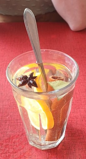 We lunchten bij Wadapartja waar ik een bijzonder kopje thee kreeg: kokend water met een schijfje sinaasappel, een kaneelstokje, een laurierblaadje en steranijs. Geen zakje, geen toegevoegd aroma, maar allemaal écht spul.