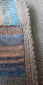 ‘Brei 3 steken recht – haal die averecht van de naald af (niet breien) – brei 3 steken recht – dit steeds herhalen.’