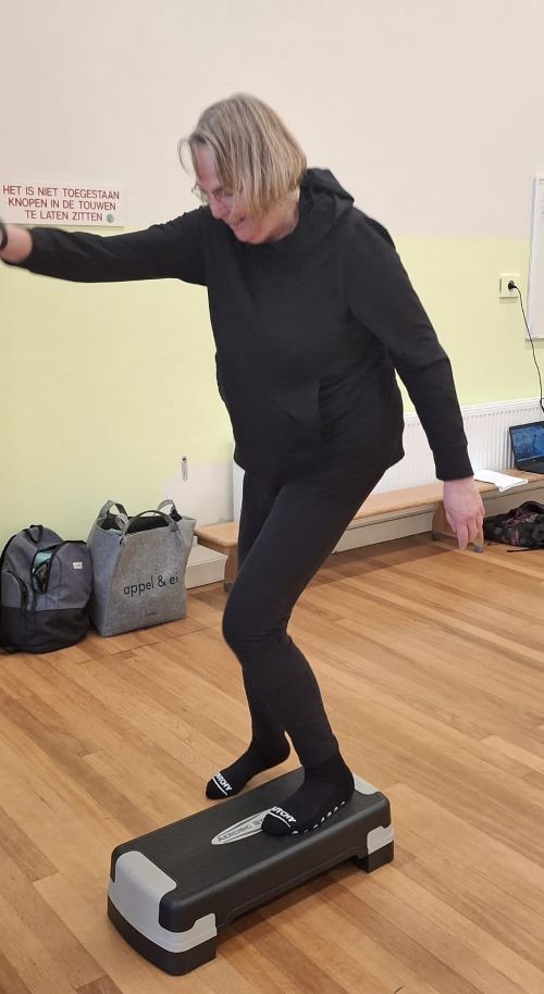 Natuurlijk ging het niet allemaal vlekkeloos. Bij het op en af stappen van het blokje moest je met je armen een tegenbeweging maken en daar heeft mijn brein kennelijk moeite mee. Dat weet ik al van Nederland in Beweging, alleen dat programma kun je een stukje terugspoelen….. nu kwam Dorien even tegenover mij staan en hielp me op gang. “Niet bij nadenken” was haar advies. Dat hielp.
