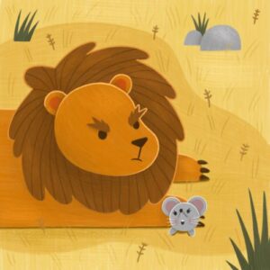 De leeuw strijkt over zijn hart en laat het muisje vrij, maar moet hartelijk lachen om het idee dat het muisje iets voor hem kan betekenen.