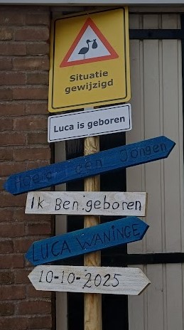 Achter het huis stond nog het bord dat Rick als trotse vader zelf na de geboorte in de tuin had gezet; daar moest ik natuurlijk een foto van maken!