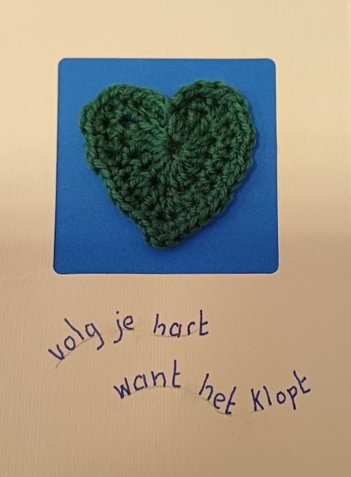 Zwanny had ook een hartje gehaakt. Dat was wat kleiner en dat had ze gelijk al op een kaart geplakt met een pakkende tekst. Daarnaast had ze ook een paar exemplaren gemaakt met de amigurumi-techniek: dat is een Japanse handwerktechniek voor het haken van kleine, opgevulde figuurtjes. “Die kun je ’s zomers vullen met lavendel” vertelde ze er bij. Vorige week kreeg ik daarover al een app van Sijcolien met een link naar de website DIYFluffies van Mariska Vos met een video van het maken van het hartje op de afbeelding.