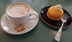 De vraag stellen is haar beantwoorden, dus even laten stonden we likkebaardend voor een vitrine met gebak: chocoladetaart, appelgebak of een soort soes.