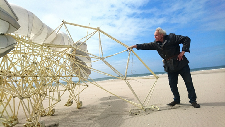 Jaren geleden liepen wij op een strand aan de Noordzee en zagen opeens een strandbeest lopen. Ik had er weleens over gelezen en het was werkelijk fascinerend om te zien: een skelet van pvc-buizen bij elkaar gehouden door tie-wraps. Het liep vanzelf, in beweging gezet door de wind. We liepen er een tijdje achteraan maar konden het amper bijhouden.