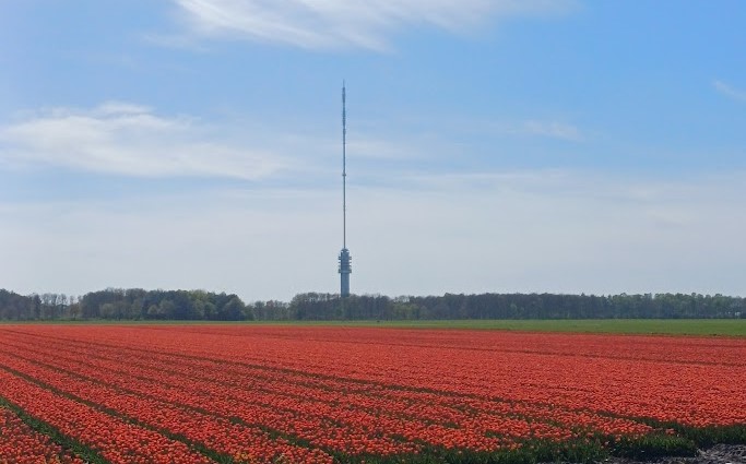 Op de afbeelding hiernaast zie je een tulpenveld aan het Oranjekanaal in Hoogersmilde met de televisietoren op de achtergrond.