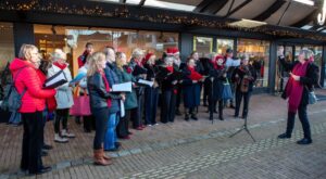En ook al deden we dit al voor de vierde keer: het blijft gek om tussen de slijter, de slager, de bloemist en de drogisterij met een koor kerstliederen te zingen. We begonnen met het vierstemmig zachtjes neuriën van Silent Night (om even in de stemming te komen) en daarna zongen we ons repertoire. Zo leuk om te doen!