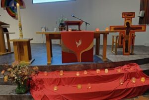 Hoe wonderlijk is het dan dat in de PKN-viering van vanmorgen dominee Sybrand van Dijk ons bij de liturgische bloemschikking vertelde over die twee soorten tijd.