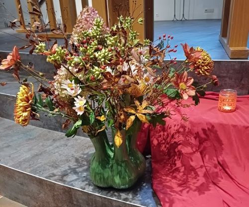 Hoe wonderlijk is het dan dat in de PKN-viering van vanmorgen dominee Sybrand van Dijk ons bij de liturgische bloemschikking vertelde over die twee soorten tijd.