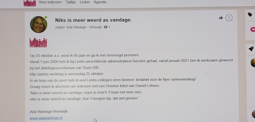 Toen was er een toespraakje van teamleider Sylvia; zij nam met de aanwezigen de geschiedenis van mijn werk voor Lentis door en zwaaide mij lof toe.